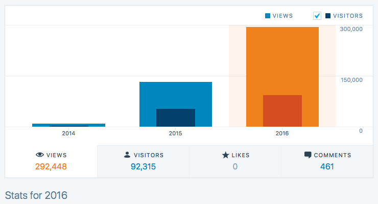 As you can see, the number of page views more than doubled from 2015 to 2016. 2015 brought in more than 130,000 views from 52,000 visitors. In contrast, 2016 brought in more than 290,000 views from 92,000 visitors! The site appears to be still growing a smidge, the average daily page views has increased from 360 in 2015 to 800 in 2016.