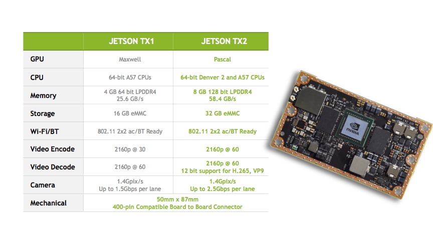 The Jetson TX2 is a new iteration of the Jetson Development Kit which doubles the computing power and power efficiency of the earlier Jetson TX1.
