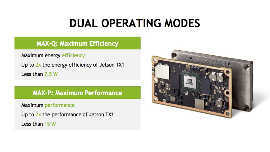 In Max-P mode, the TX2 just flat out goes for it in the power budget of 15W. This provides about twice the performance of the Jetson TX1 at its maximum clock rate.