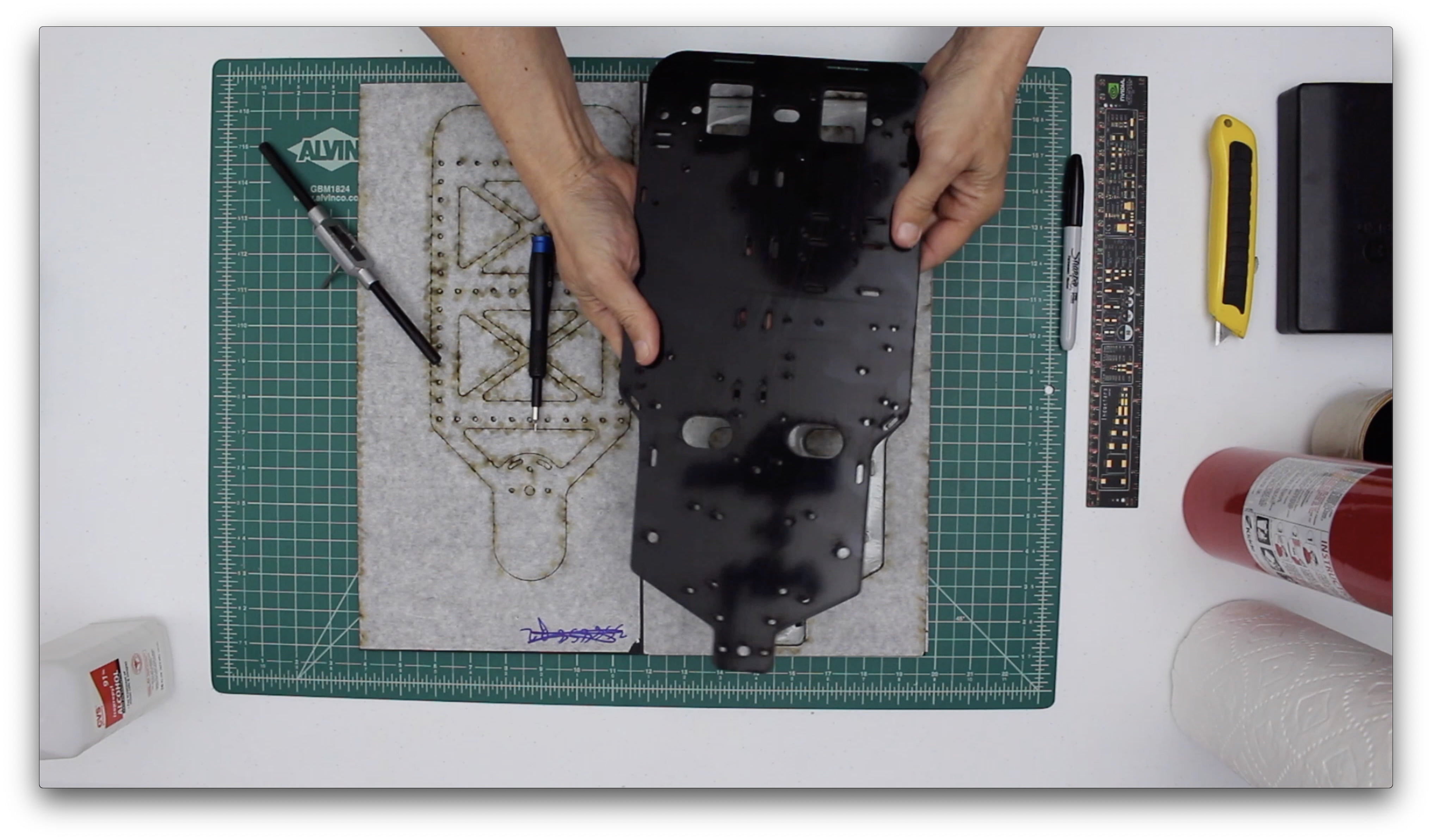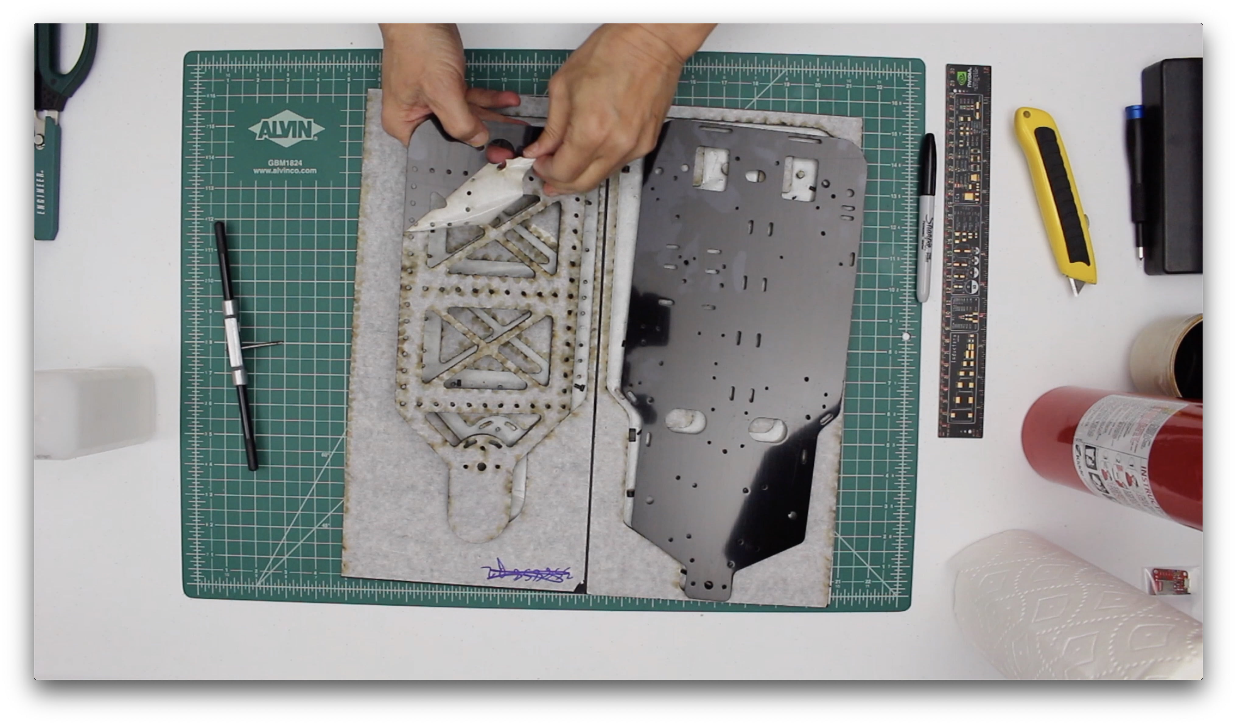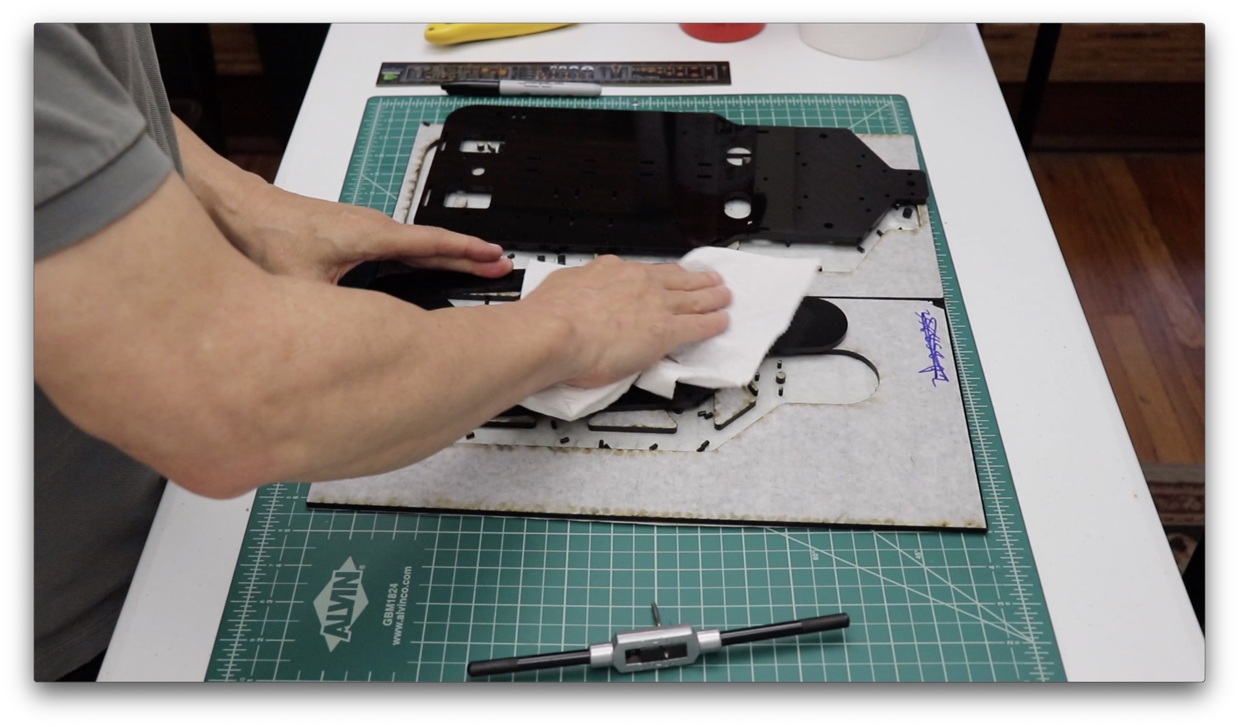 After removing the overlay sheet, clean the platform decks. The laser cutting process leaves a residue which tends to create a mess. In the video, isopropyl alcohol is the cleaning agent; some soap and water can be used as a substitute. Use a lintless towel if possible, you can wipe it down afterwards with a micro fiber cloth if need be.